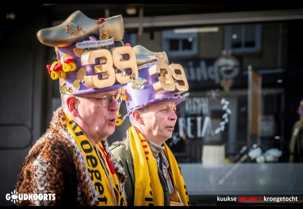 Een flinke drol, een tooi van schapenwol en bliksemschichten en een camera: zomaar een greep uit de hoofddeksels die Geert-Jan Janssen en Hans Kerstens tijdens hun 39 deelnames aan de Kuukse elfkroegetocht droegen. Het zijn echte feestgangers, die tijdens de eerste editie in 1986 – toen nog verspreid over vier dagen – het evenement voornamelijk gebruikten als excuus om in ieder Cuijks café een biertje te drinken.